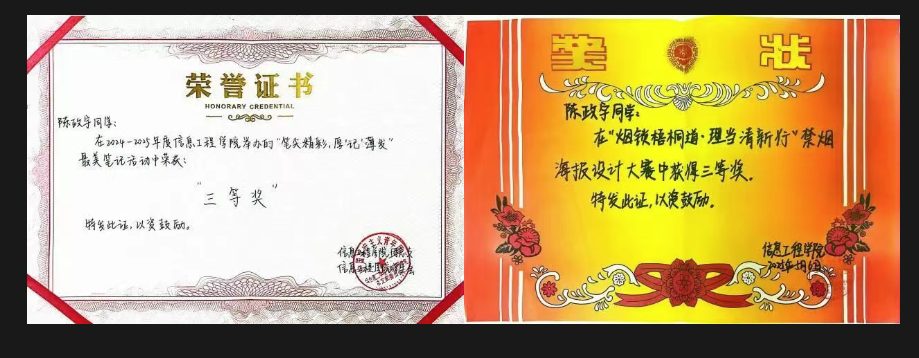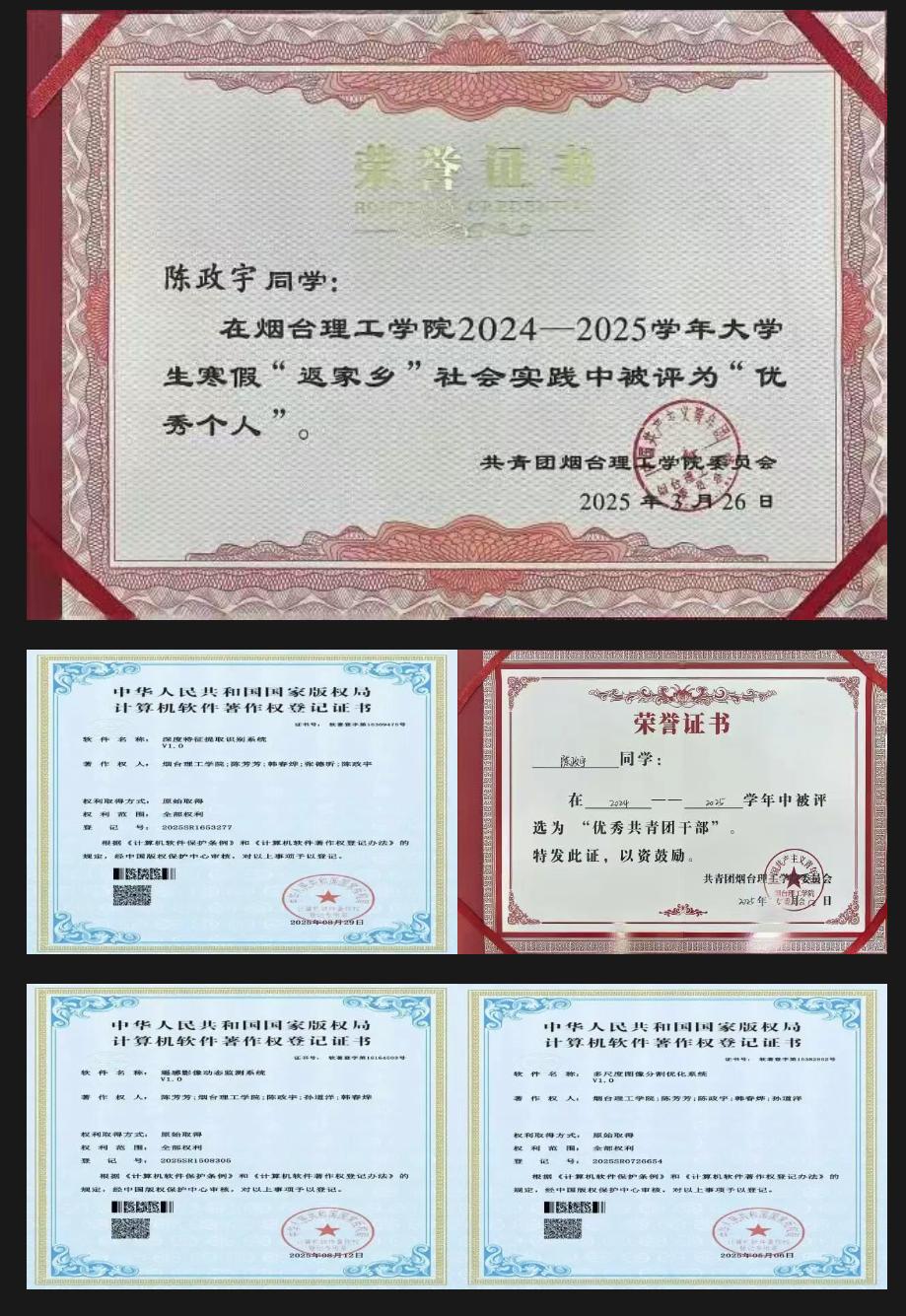陈政宇同学思想积极向上,始终以高标准要求自己。学习勤奋刻苦,竞赛成果丰硕,充分展现了较强的专业能力和创新思维;工作认真负责,服务意识突出,切实发挥了共青团干部的模范带头作用;实践能力过硬,主动将所学知识应用于实际,彰显了青年学子的责任担当。希望他在未来的道路上,继续保持这份热忱与韧劲,不断突破自我,在更广阔的舞台上绽放光彩,成长为德智体美劳全面发展的优秀人才。