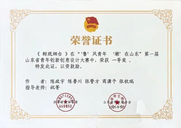在第一届山东省青年创新创意设计大赛中,他结合计算机专业优势,凭借独特的创意视角、扎实的设计功底与对城市形象的精准把握,作品在众多参赛作品中脱颖而出,成功斩获省级一等奖,为公司赢得荣誉的同时,也诠释了当代青年对城市形象的思考与担当。此外,他依托扎实的专业知识,成功申请3项软件著作权,将理论知识转化为实际创新成果,彰显了较强的创新实践能力。
