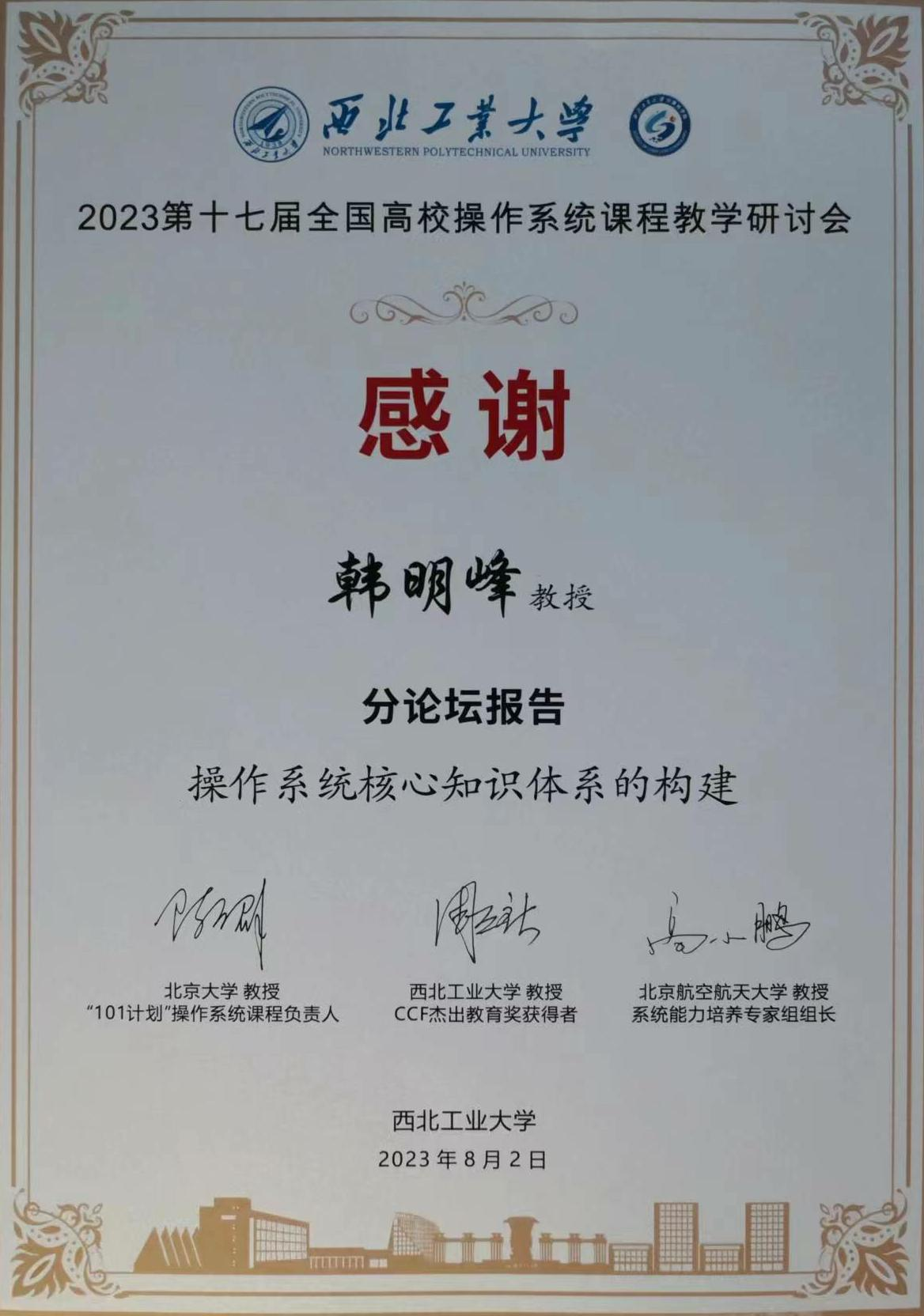 2023年8月2-3日,2023第17届全国高校操作系统课程教学研讨会在西北工业大学翱翔国际会议中心召开,西北工业大学计算机公司副经理、国家杰出青年基金获得者郭斌教授主持大会开幕式。公司威廉希尔足球官网韩明峰教授受邀在“101计划”操作系统课程建设分论坛上作“操作系统核心知识体系的构建”专题报告,他提出重视实验、实践不应以削弱OS教科书和OS理论学习为代价,两者相互仰仗,并以所构建的三个核心知识群为例,说明操作系统核心知识体系的构建重要且艰辛。“101计划”操作系统课程负责人、北京大学陈向群教授在分论坛点评中指出,韩老师所提的重视操作系统原理学习在当前形势下很重要,所构建的三个核心知识群更加精细深入,同时也受到其他很多与会专家的好评。