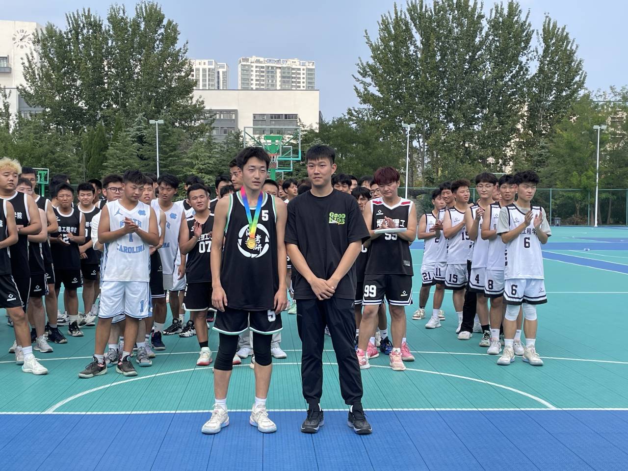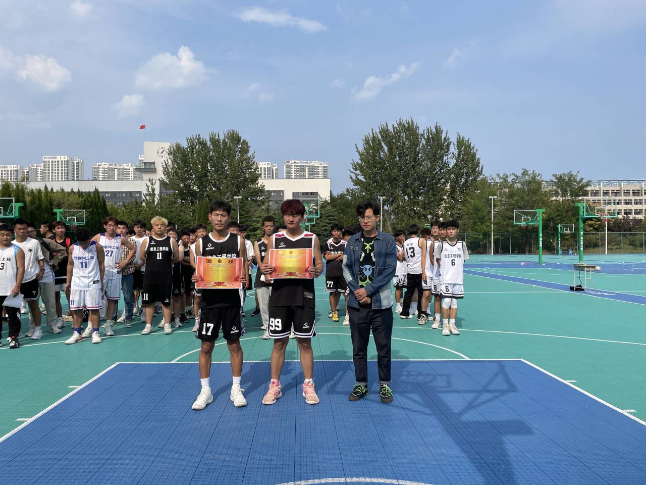 比赛过程中,参赛健儿英姿勃发,精神振奋,斗志昂扬,他们迅速的进攻,扎实的防守,漂亮的三步上篮,完美的攻防转换,全方位的战术对接让比赛更具观赏性,呈现出力量与速度的视觉盛宴。比赛过程跌宕起伏,全体观赛师生喝彩不断,各个班级的啦啦队为球员的每一次精彩表现尽情欢呼,这种热情赋予赛场上的队员巨大的精神动力。他们肆意地挥洒着青春的汗水,年轻的身体碰撞着、躲闪着,配合、协同、鼓励、担当、共同配合后的进球,失球后各司其职的防守,每个人都有着明确的分工。每一位队员在篮球场上发扬着拼搏的精神,充分展现着信工学子的风采。根据积分排名,最终23级专升本计算机队获得冠军,23级专升本物联网队获得亚军,23级计算机二队获得季军。