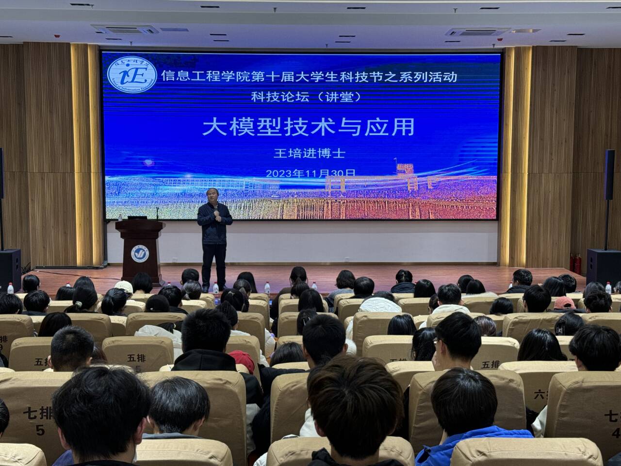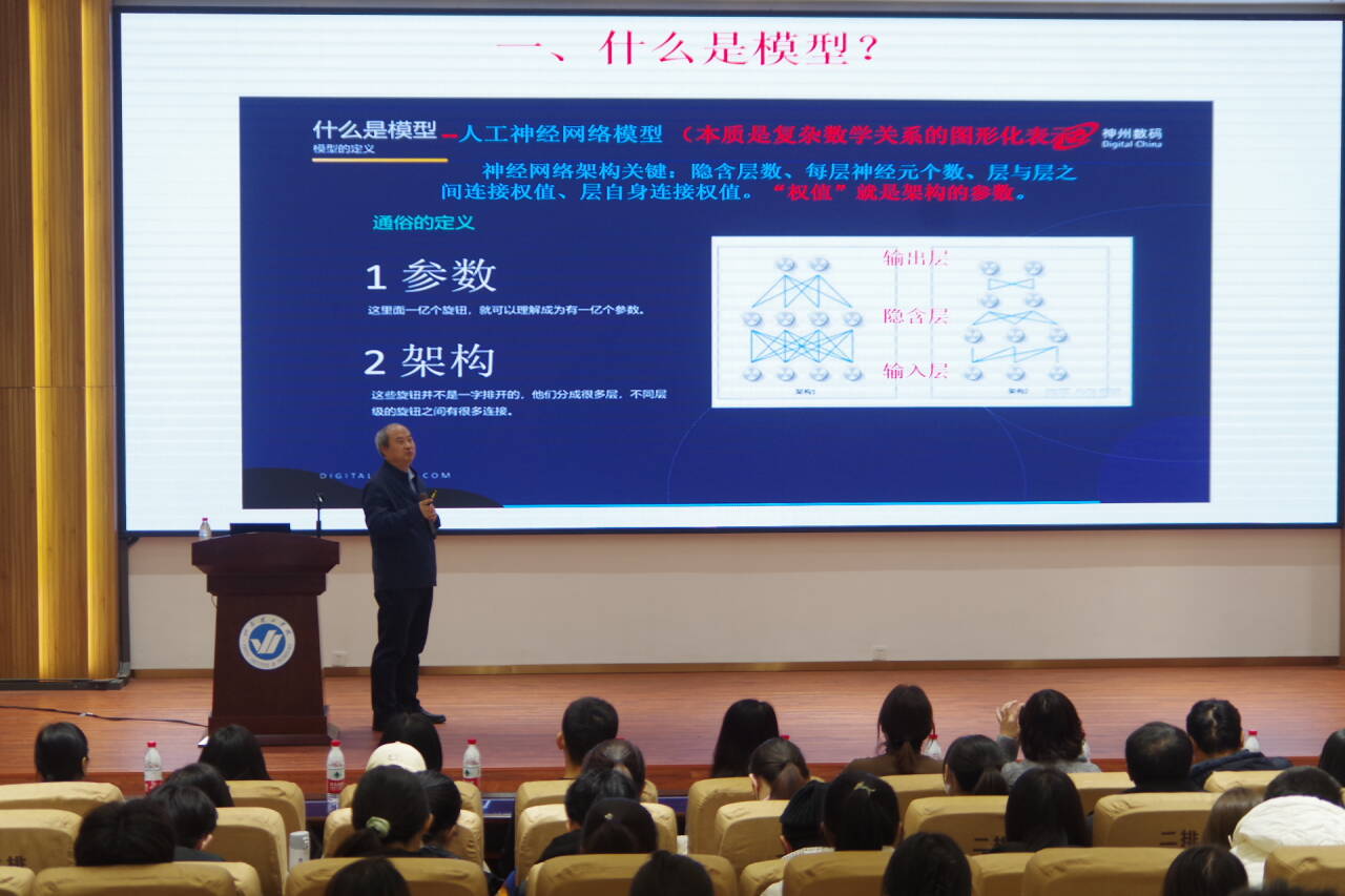 大算力、大模型、大数据,导致了“智能涌现”;与此同时,人工智能发展方向从辨别式走向生成式,基于大模型技术的生成式人工智能将导致第四次工业革命。那么,什么是大模型?技术架构是什么?应用前景如何?王博士聚焦当前IT技术热点-大模型技术,结合自身实践经验,从大模型内涵、大模型技术架构基础-人工神经网络的起源与发展、用于大模型架构的主要人工神经网络模型(GAN、CNN、RNN、Transformer等)、多模态大模型、大模型与ChatGPT、GPT关系、大模型与人工智能关系、大模型类型与当前应用领域等方面做了精彩讲解。在大模型时代,软件开发模式将发生天翻地覆的变化。软件开发出现新“二八定律”:80%代码由AI生成,20%代码由人工修改完善。软件开发从过去的结构化分析或面向对象分析、设计、实现过程转变为基于人类诉求的提示词分析、AI辅助开发、数据驱动、一键调度大算力、快速部署实现过程。未来,所有的应用都将基于大模型来开发。王博士强调,当下我们正处在全新起点,这是一个以大模型为核心的生成式人工智能新时代,大模型改变了人工智能,大模型成功地压缩了人类对于整个世界的认知,让我们看到了实现通用人工智能的路径,大模型即将改变世界。希望教师、同学们要紧跟时代的步伐,善于学习,掌握最新技术,提升自身技能,用积极的心态拥抱大模型时代的到来,迎接第四次工业革命!