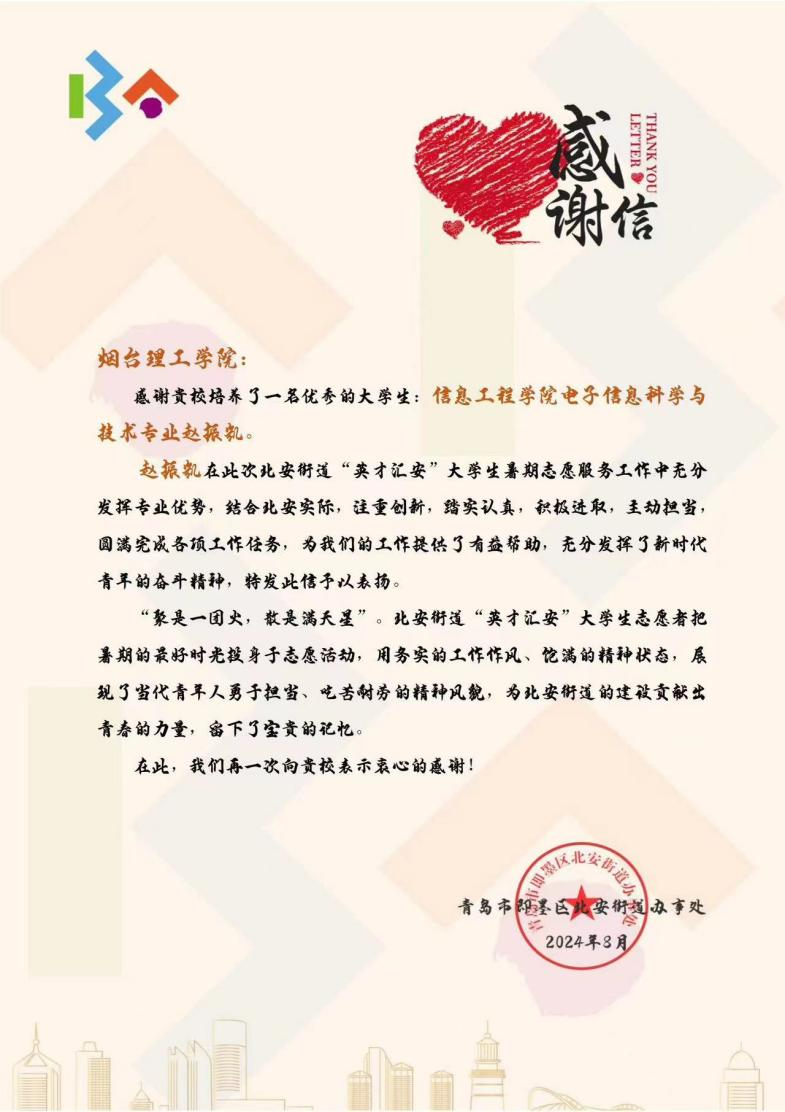 感谢信中写道,赵振凯注重创新,踏实认真,积极进取,主动担当,圆满完成各项任务。“聚是一团火,散是满天星”,赵振凯把暑期的美好时光投身于志愿服务,为北安街道的建设贡献出了青春的力量,留下了宝贵的记忆。