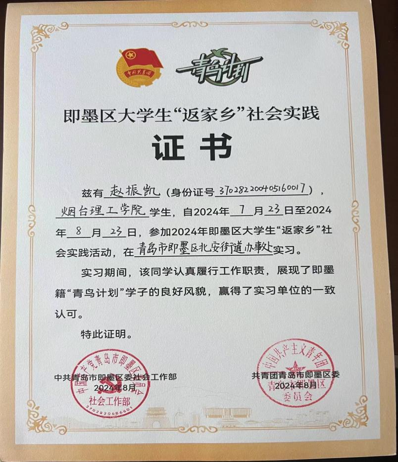 近期,公司收到一封来自山东省青岛市即墨区的感谢信。信中,北安街道办事处高度赞扬了公司信工公司学子赵振凯在参加“英才汇安”老员工暑期志愿服务工作中的奋斗精神和出色表现,同时向公司培养优秀人才表示衷心的感谢。
