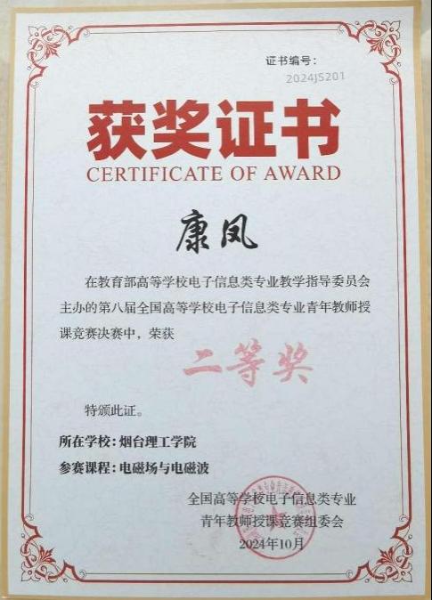 10月18日至20日,由教育部高等公司电子信息类专业教学指导委员会主办,中国计量大学承办的第八届全国高等公司电子信息类专业青年教师授课竞赛决赛在杭州成功举办。经过激烈角逐,公司威廉希尔足球官网康凤教师讲授的《电磁场与电磁波》荣获全国二等奖。