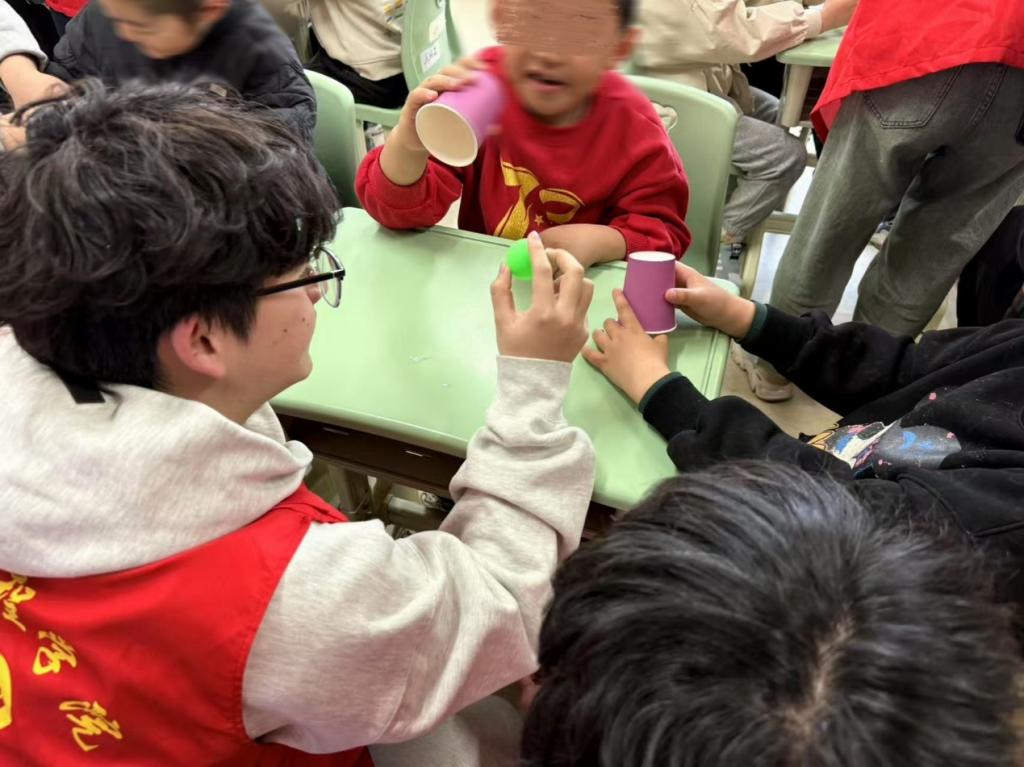 活动伊始,志愿者通过纸杯扣球、盖糖果等趣味游戏引导孩子们进行注意力训练,手把手教授技巧并给予实时鼓励。在游戏经验分享环节中,志愿者耐心交流,消除了彼此间的隔阂。最后的手工创作阶段,孩子们在志愿者协助下完成糖果花制作,逐渐敞开心扉,在欢声笑语中消融了初见的陌生感,现场洋溢着创意与温暖交融的氛围。志愿者们纷纷表示,此次活动不仅增强了自身的社会责任意识,更认识到关爱特殊群体需要全社会的共同努力。今后他们将会积极参与孤独症儿童康复训练、技能帮扶等专项服务,为孤独症儿童搭建包容成长的桥梁。
