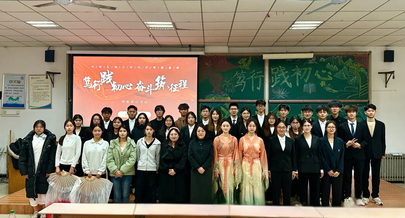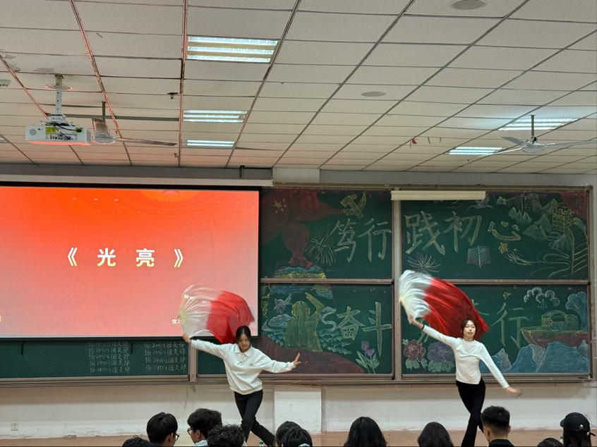 活动在歌曲《末班》中拉开帷幕,富有感染力的歌声如星火般点燃现场氛围。紧接着,古筝独奏《彝族舞曲》缓缓流淌,悠扬旋律勾勒出传统韵律之美,让在场师生沉醉其间。随后,朗诵《奋斗织梦,初心笃行》登场,朗读者以真挚声音诠释“初心不改,奋斗不止”的信念。舞蹈《拉丁串烧》、《光亮》接踵而至,舞者们以热情奔放的舞姿将青春活力展现得淋漓尽致。接着,《向光而行》等温暖的歌声传递着逐梦路上的力量,激励众人向着光亮前行。《武术劲扇》的表演更是将活动推向高潮,表演者以扇为器、以武为魂,刚柔并济的太极风采尽显中华武术的深厚底蕴。在“你画我猜”互动环节,各组队员心有灵犀、默契配合,此起彼伏的欢笑进一步拉近了彼此的距离。古典舞《青丝玄鸟》轻步曼舞,巧妙演绎传统韵味与青春朝气的碰撞。最后,相声《学外语》以幽默诙谐的语言展现语言学习的乐趣,为整场活动画上圆满句号。活动尾声,陈佳琳老师总结点评,她充分肯定了参演同学的精彩表现与筹备团队的用心付出,指出本次活动以丰富的艺术形式为载体,既生动展现了青年学子对初心的坚守与对奋斗的诠释,更彰显了青年的创新活力与青春风采。